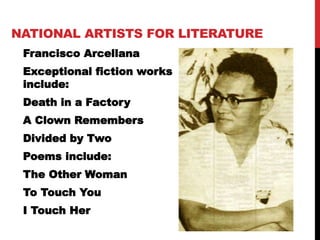 FRANCISCO ARCELLANA National Artist for Literature 1990 September 6 1916 August 1 2002 Writer poet essayist critic journalist and teacher and one of the most important progenitors of the modern Filipino short story in English.